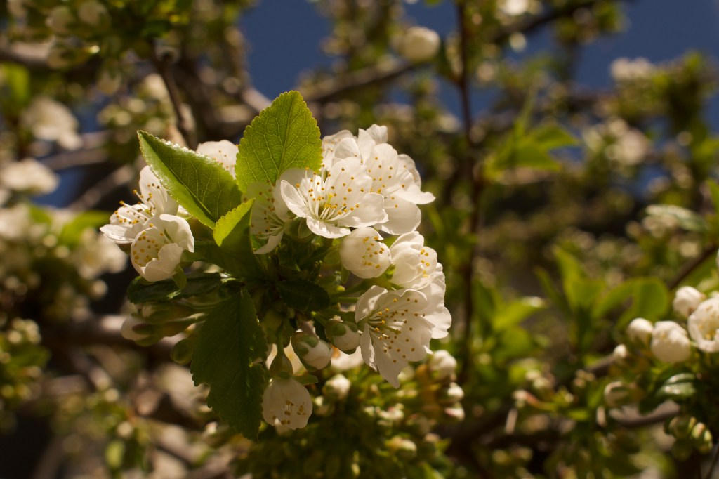 “Plums are a stone fruit along with cherry, peach, nectarine, apricot and almond. Several species of plum exist, so they are highly variable in color and flavor, as well as climactic adaptability and disease resistance. In spring, the abundant, white flowers attract native bees.”