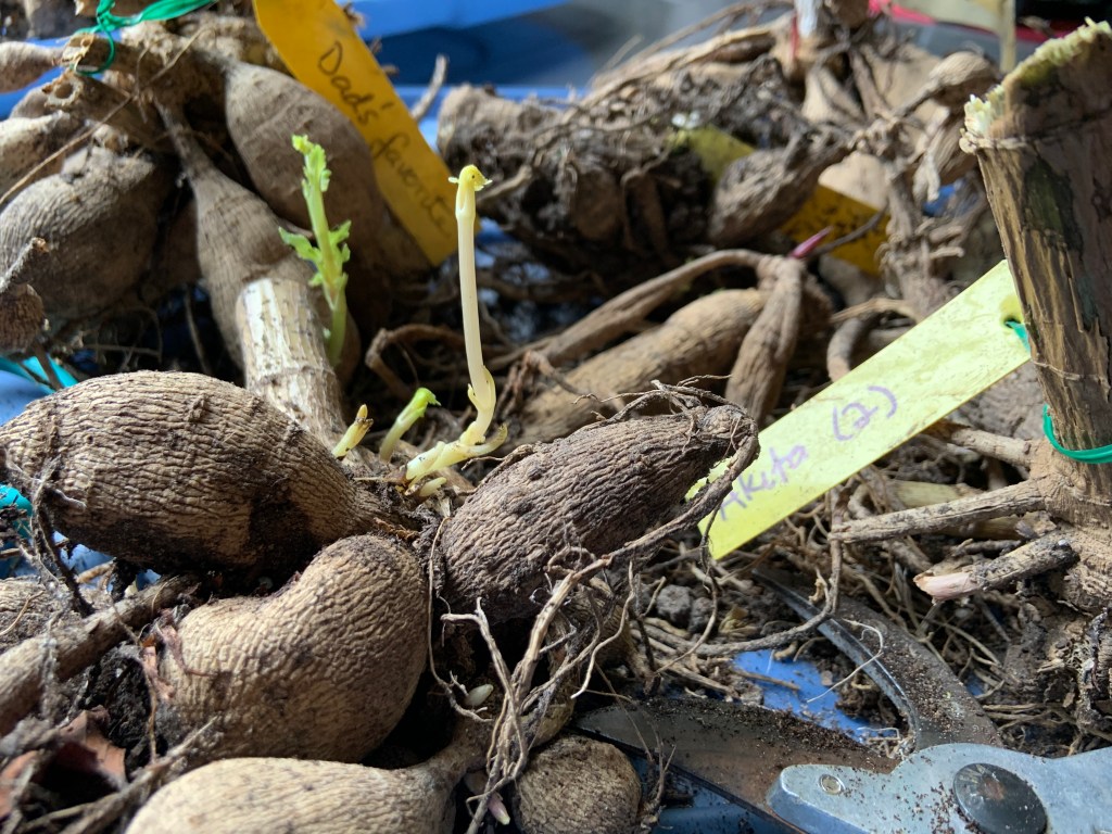 - Dahlias are striking and take center stage in arrangements. They are started off as shriveled up tubers that look like something for the compost bin but then can turn into plants as high as 5 feet in no time. Dahlias are not winter hardy and must be dug up and stored until the next year. Proper harvesting and storage is needed but there are many resources on the web to take you through the step by step processes.
