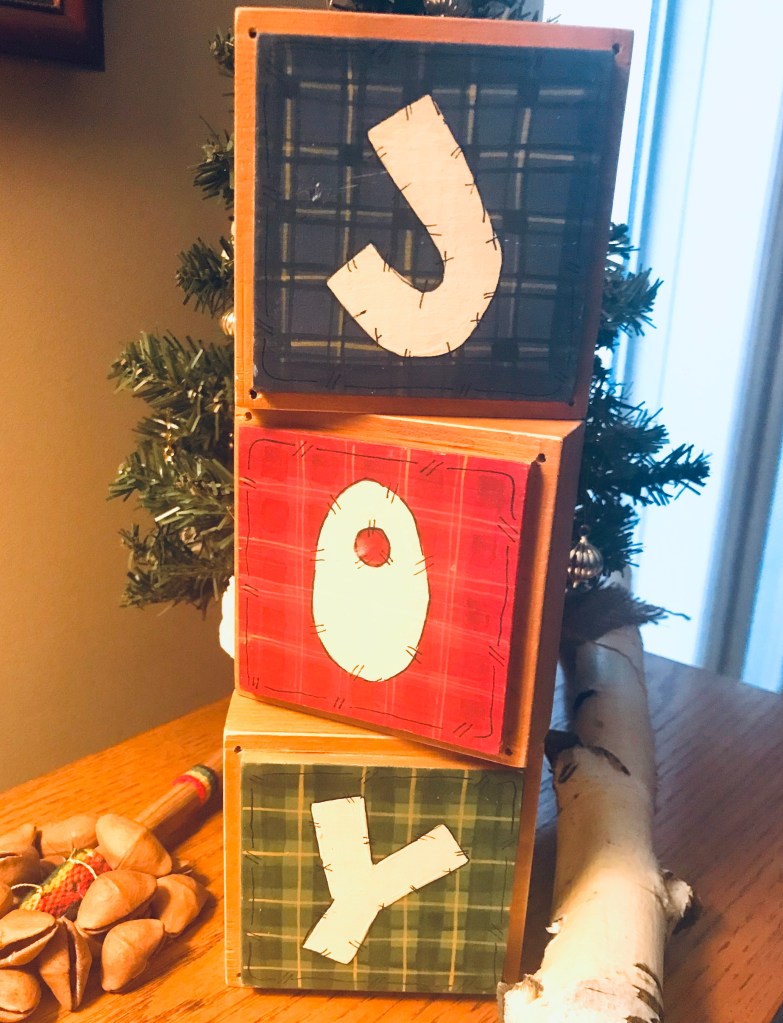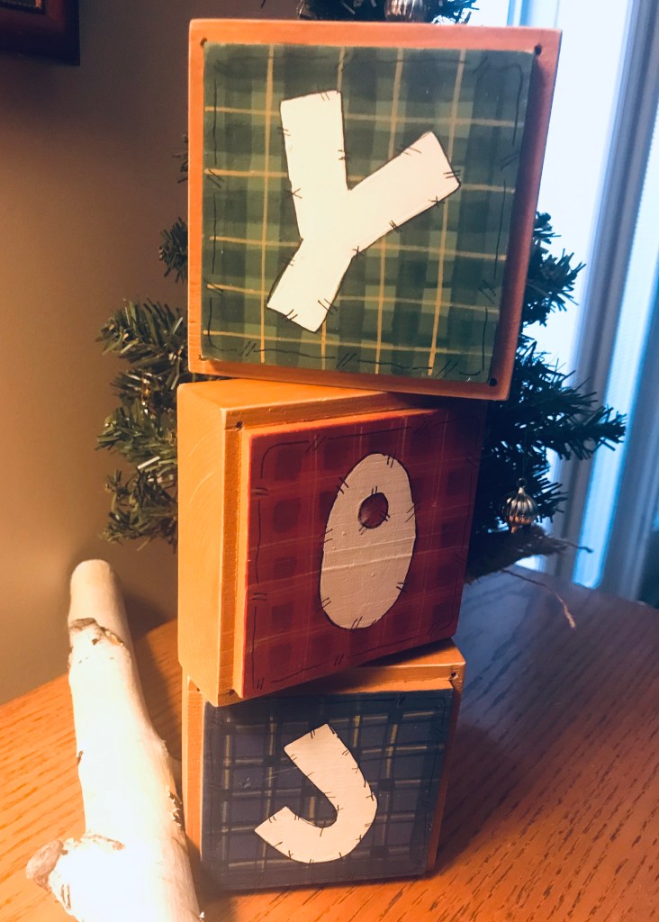 Setting up the decorations, Lucy planted the J block on the bottom as the first letter, building upward to spell “JOY”. Then Allan came over and said “What does “YOJ” mean”? So do we read up or do we read down? To this day, in our household, we sing “YOJ to the World”!