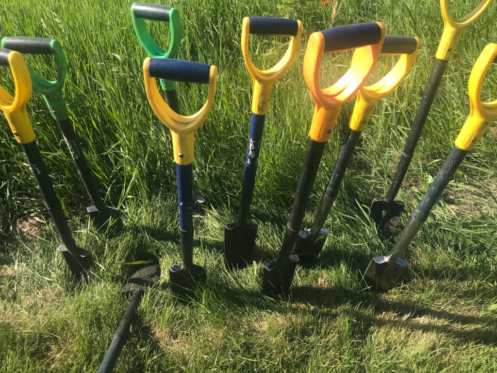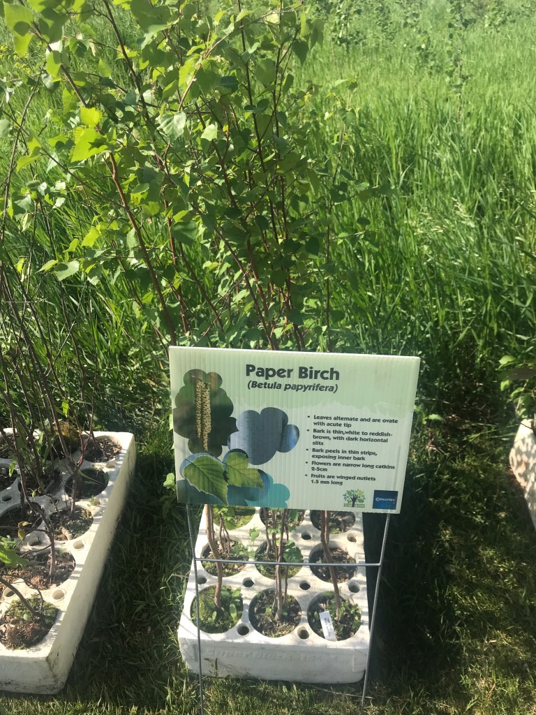 The organizers send out detailed information on how to dress (long pants and closed toe shoes), as well as specific directions on finding the “field” you are planting. It seems everyone found the site. We plant either in the morning or afternoon for two and a half hours. Luckily it was perfect weather on the day we planted, but we are sure it can get hot. A hat, sunscreen, bug repellent, water, are all a good idea. Root for Trees provides the fitted gloves, tiny spades and trees/bushes to plant. The site is already mapped out, with a perimeter, and each tree is planted a metre apart, pairing the birch trees, and bushes need to be half a metre apart.