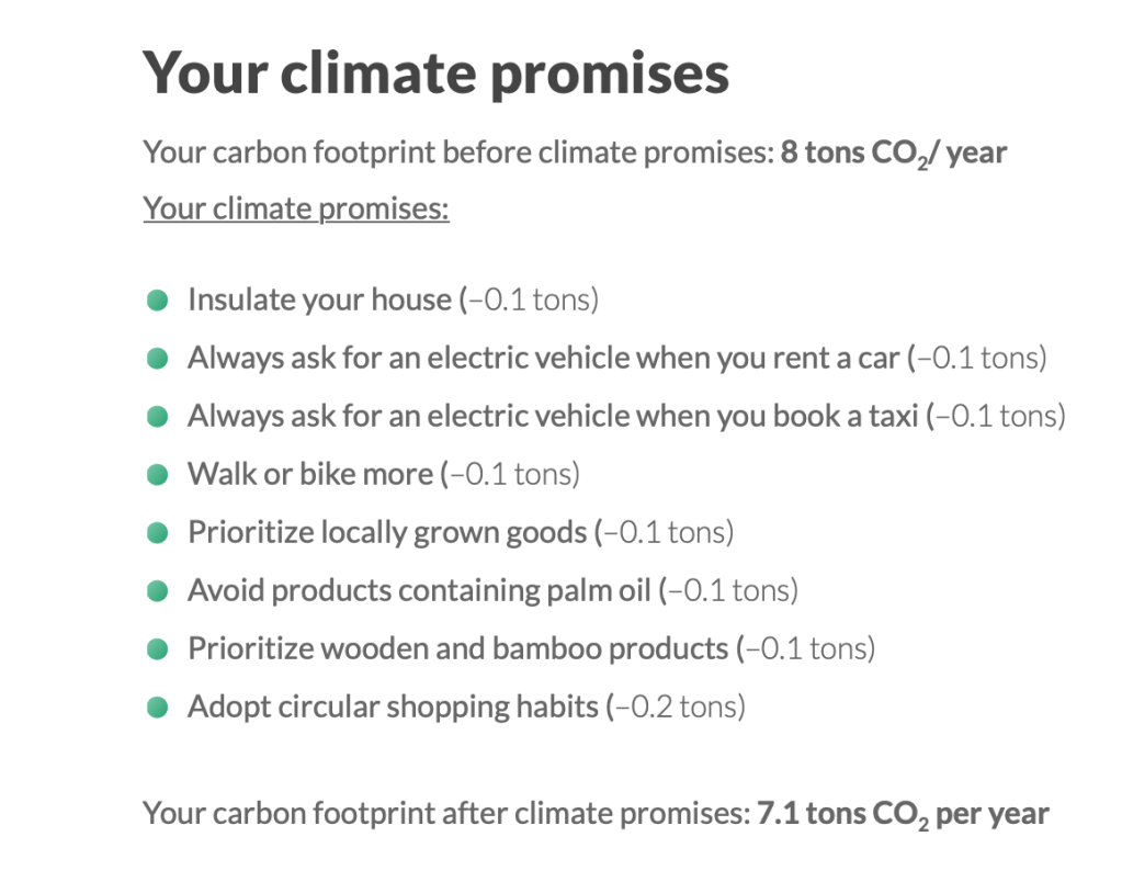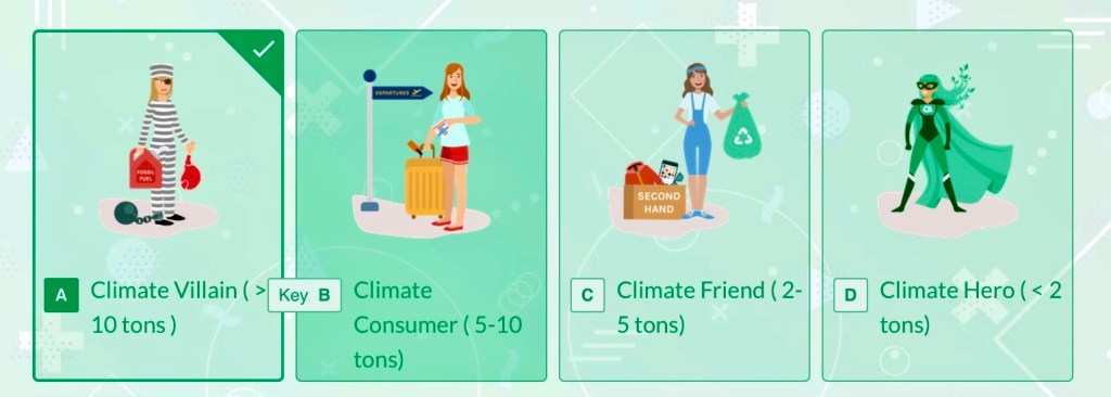 Inspired by Lucy, her personal “Carbon Hero,” Catherine followed suit, and calculated her carbon footprint also using Carbon Hero. She has a carbon footprint before promises of 6.7 tons CO2 per year, joining Lucy in the “Climate Consumer” category.